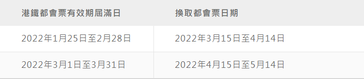 乘客可在3月15日至5月14日期間,携同到期的都會票到指定車站的客務中心更換,新發出的都會票要在發出14日內啟用,有效期為40日。