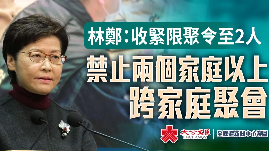 大公文匯全媒體報道,本港第五波疫情嚴峻,行政長官林鄭月娥今日(8日)下午見記者宣布最新防疫措施,包括修訂599G章,收緊公眾地方群組聚會人數上限至2人。同時首次引入限聚令適用於私人處所,禁止兩個家庭以上在私人地方進行跨家庭聚會。