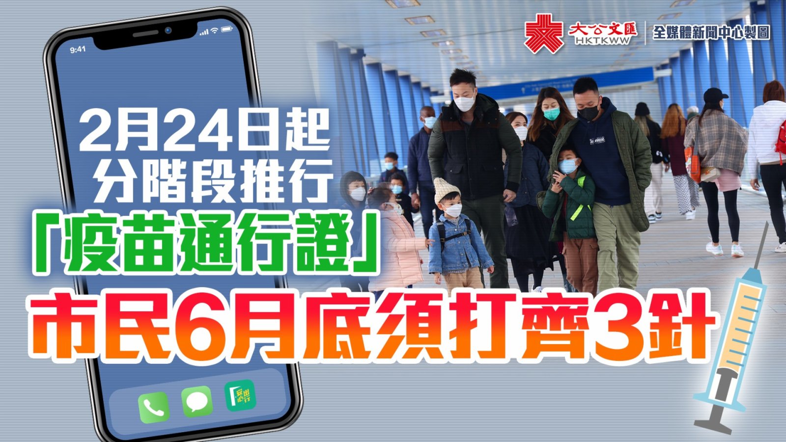食物及衞生局常任秘書長(衞生)陳松青下午在疫情記者會上表示,「疫苗通行證」將由2月24日起分三個階段推行逐步推行。分別是第一階段:由2月24日起,12歲或以上人士進入指定處所,須最少接種一劑疫苗。第二階段:由4月底開始,要求所有18歲以上人士必須接種最少兩劑疫苗;12歲至17歲人士須接種最少一劑疫苗;第三階段:由6月底開始,所有18歲以上人士,如果接種第二劑疫苗超過9個月,則必須接種第三劑疫苗。