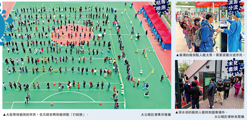 疫情幾何級爆發,昨日有65個指明地點被納入強制檢測公告,檢測站人頭處處。在油塘道遊樂場的流動檢測站,有女士怒罵一旁的男子排隊打尖,「一拖四,咁無恥!」在中環愛丁堡廣場的檢測站,一條街開外便見到檢測人龍,不少人早已預計輪候時間較長,帶備「私家椅」供排隊時休息;有剛完成採樣的市民說,排隊排3小時8分鐘,影響工作,十分無奈。