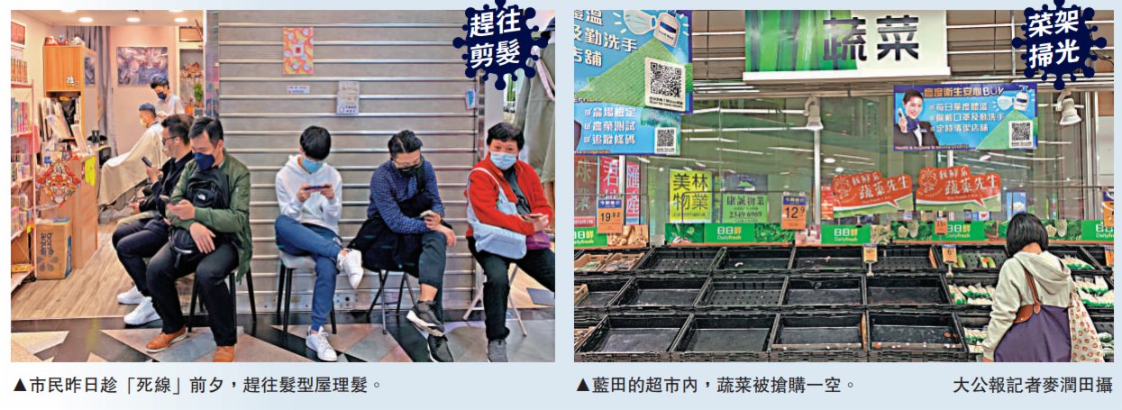 (大公報 記者 邵穎)疫情肆虐,本港昨單日新增確診個案首次破千,市民人心惶惶,緊張氣氛隨處可見:多間超級市場貨架「清零」,各類蔬菜傍晚時分已被搶購一空;多區出現排隊檢測人龍,等候時間長達數個小時。由於政府收緊防疫措施,理髮店及髮型屋今日起須停業至本月24日,不少市民顧不得「正月不理髮」的禁忌,在快剪店門口排起長龍……有市民慨嘆,處處排隊影響工作,「做咗一樣嘢,就冇時間做另一樣。」