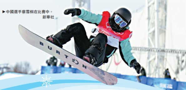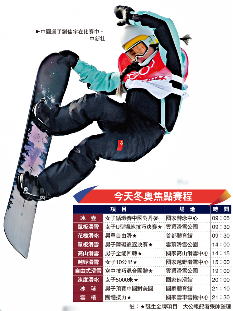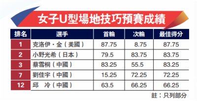 大公報援引中新社報道:北京冬奧會單板滑雪U型場地技巧昨天進行預賽,中國選手劉佳宇、蔡雪桐和邱冷順利晉級女子組決賽。