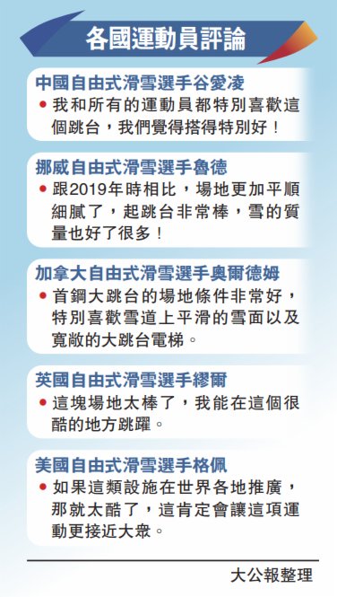 曾在此地奪得2019年「沸雪」自由式滑雪大跳台項目冠軍的挪威男子自由式滑雪運動員魯德說:「跟2019年時相比,場地更加平順細膩了,起跳台非常棒,雪的質量也好了很多!」美國自由式滑雪選手霍爾對首鋼滑雪大跳台的獨特風景情有獨鍾:「背景是一些山脈、廟宇、城市和鋼鐵廠,背後那些瘋狂的煙囱很酷。」他的隊友格佩表示,如果這類設施能在世界各地推廣,那就太酷了,這肯定會讓這項運動更接近大眾。