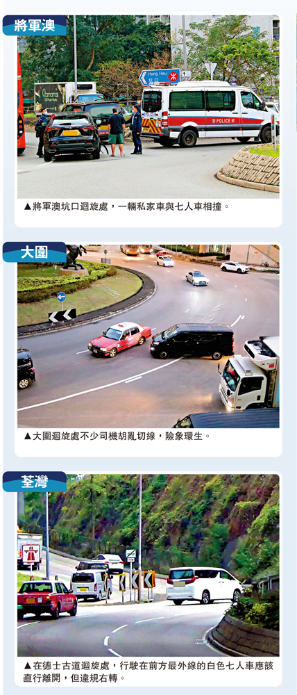 此外,記者在元朗博愛迴旋處及上水雞嶺迴旋處,均發現不少司機不熟悉迴旋處交通守則,或者明知故犯,違規駛離迴旋處。