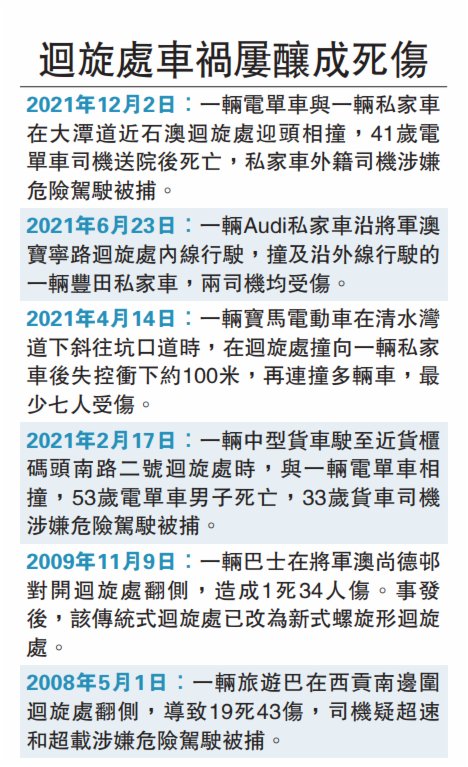 (大公報記者 黃山、蘇榮、調查組)本港車多路窄,路況複雜繁忙,需使用大量迴旋處疏導。然而舊式迴旋處設計落後,難以適應現時的道路發展,過去多年發生多宗嚴重死亡車禍,迴旋處往往被駕駛者視為「虎口」。為減少迴旋處交通意外,運輸署自2004年起試推行新的螺旋形迴旋處,效果雖不錯,但推廣「龜速」,至今僅23個迴旋處實行新例。現時新舊迴旋處並存,但「讓車」規定卻完全不同,令駕駛者混淆不清,難以適應,導致意外頻生。