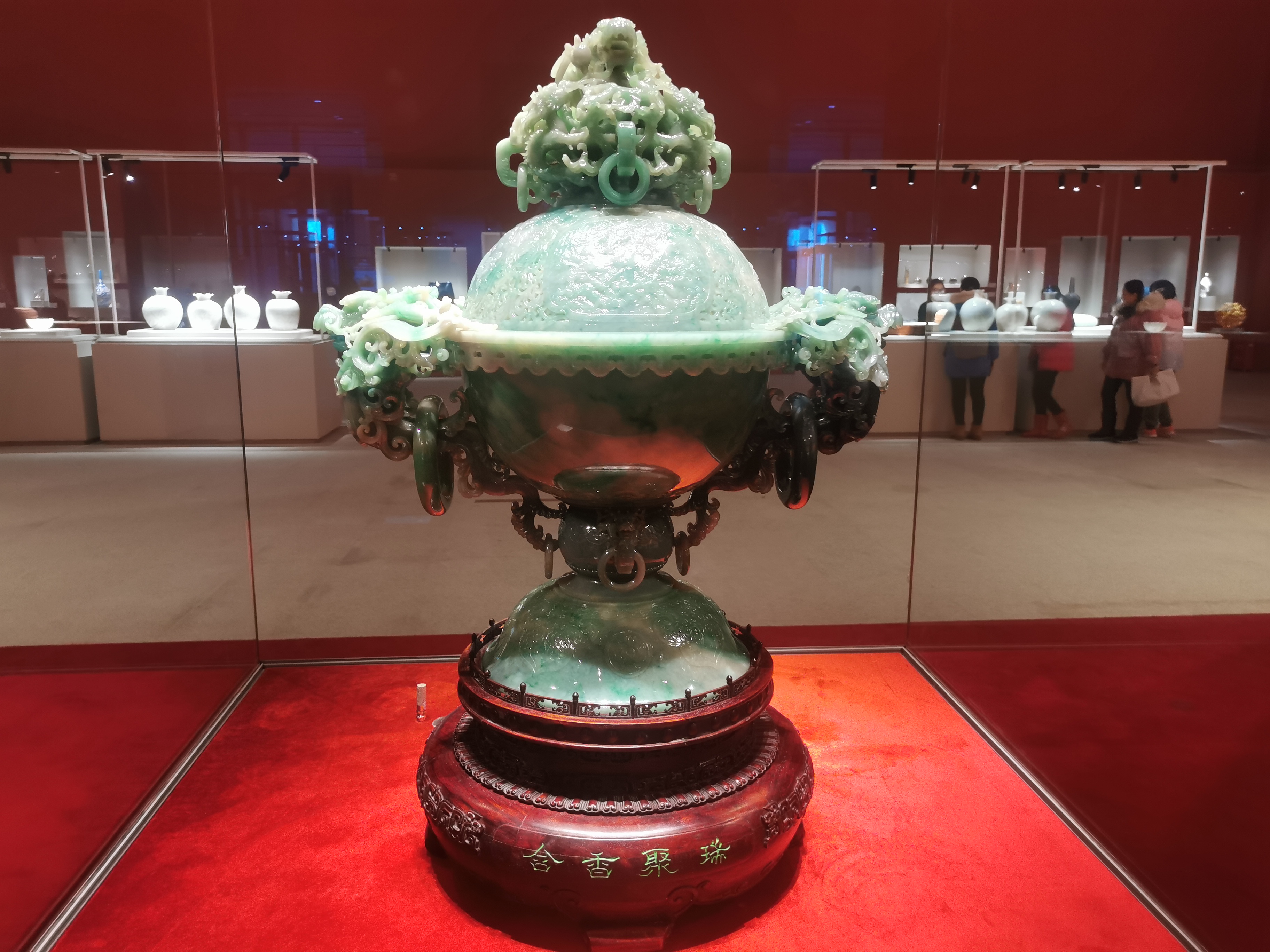 作品《含香聚瑞》,高65厘米,1985年由北京玉器廠設計製作。原料重274.4公斤,類似長方形,綠翠多,村料質地優良,所以設計者們將其設計為球形花薰。作品不僅採用了中國玉器歷史上高難度的套料工藝,並用料中套料,小料做大的手法,增加原料綠翠的面積。花薰由底足、中節、主身、蓋、頂五部分組成,以主身和蓋組成的球體為中心,周圍飾以圓雕的龍。在蓋、中節、底足三部分,以深淺浮雕的技法和開光的藝術形式,裝飾傳統的青龍、白虎、朱雀、玄武圖案。蓋的周身除四個開光圖案外,通體鏤雕唐代傳統的蕃草圖案。