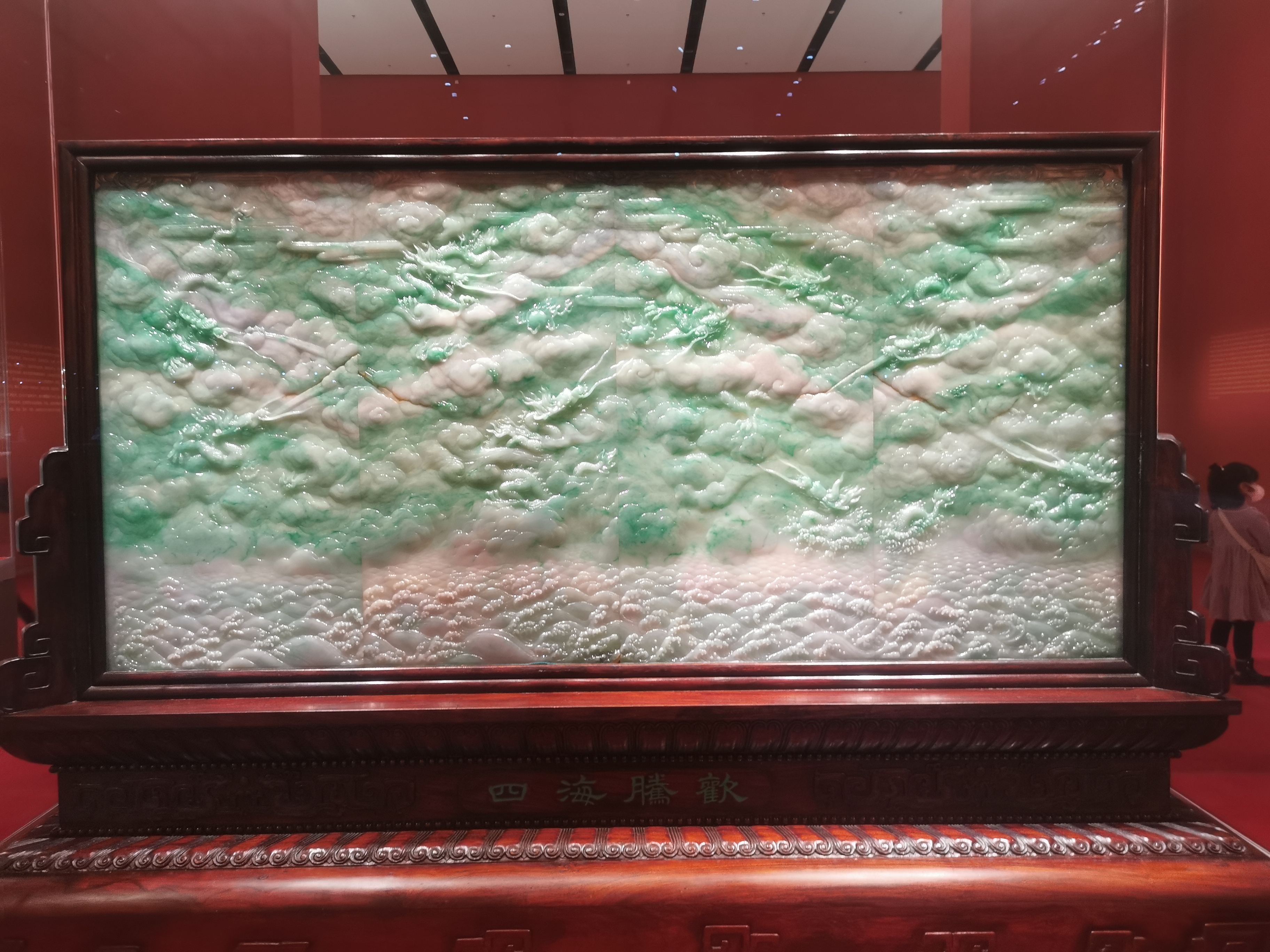 作品《四海騰歡》,1982年由北京玉器廠開始創作,1989年製作完成。原料的形狀方正而規矩,面積大,翠色多而密,色澤鮮明,質地光潤、透亮。設計者將原料剖為4片,每片厚度僅為1.8厘米;之後將這4片翡翠拚合成一塊高74厘米,寬146 厘米的大插屏,最大限度地展示翡翠晶瑩剔透的質地。拚合後的翡翠不僅平整、嚴謹,而且接縫處平直一致,沒有絲毫間隙。