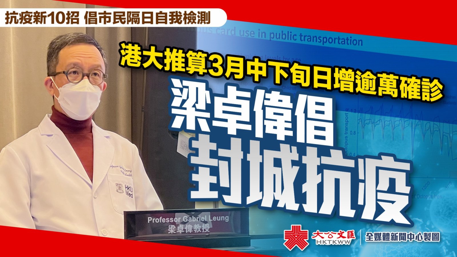香港大學李嘉誠醫學院(港大醫學院)今日(10日)舉行新聞發布會,講述有關第五波Omicron疫情發展模擬模型。根據港大醫學院預測,在由今日開始實施新一階段嚴格的防疫措施後,預計香港本輪疫情會在3月中旬達到高峰,高峰期預計日均確診個案破萬。若情況持續,至3月中下旬每日約有468人需入院治療,將超出病床負荷,若醫療系統崩潰,料6月中旬死亡個案將增至近千人。港大醫學院院長梁卓偉教授及其團隊提出「抗疫新10式」,其中包括建議港府積極考慮封城禁足等防疫措施,以達快速控制疫情目的。