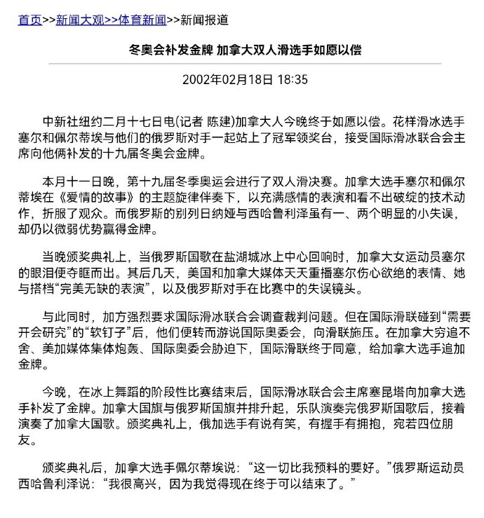 之前有過因裁判打分不當而補發金牌的先例,那是2002年的鹽湖城冬奧會,當時受委屈的是來自加拿大的花滑選手。據央視報道,調查中,法國女裁判承認打分時,受到某國協會的壓力而壓低了加拿大選手在自由滑中的分數。
