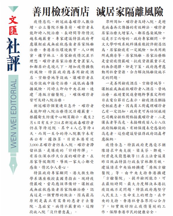疫情惡化,新冠病毒確診人數倍增,公立醫院不勝負荷,確診者未能即時入院治療、長時間等待情況越來越嚴重,專家建議特區政府考慮讓輕症或無症狀感染者居家隔離治療。香港居住環境狹窄,人口稠密,樓宇林立,居家檢疫情況並不理想,確診者居家治療更會置家人和鄰居於危境之下,增加疫情擴散的風險。特區政府應善用檢疫酒店、空餘營地等設施,讓確診者在這些設施中接受治療,減低病毒傳播風險,同時立即向中央求助、速建「港版方艙醫院」,確保確診者皆可及時入院治療。