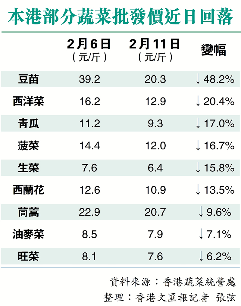 根據蔬菜統營處數字顯示,昨日豆苗平均批發價為每斤20.3元,較五日前的2月6日39.2元批發價大幅回落48.2%,西洋菜則每斤批發價12.9元,下跌20.4%,其他如青瓜、菠菜、生菜及西蘭花等均有雙位數字的跌幅。