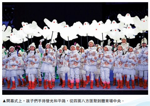 二月四日二十時零四分,開幕式準時在國家體育館「鳥巢」開始。這「二十四」並不是偶然:二十四個節氣伴隨着描述它的古詩娓娓出場;二十四道激光從高處投射而來,雕刻出晶瑩剔透的五環;二十四分,中國代表隊揮着五星紅旗準時出場。由500個孩子拿着和平鴿組成的畫面裏,有一隻鴿子走失了,這也不是偶然,它另含深意──一鴿都不能少,一刻也不能分「鴿」。這展現了中華民族深厚的文化底蘊,這也是中國人才懂的浪漫。
