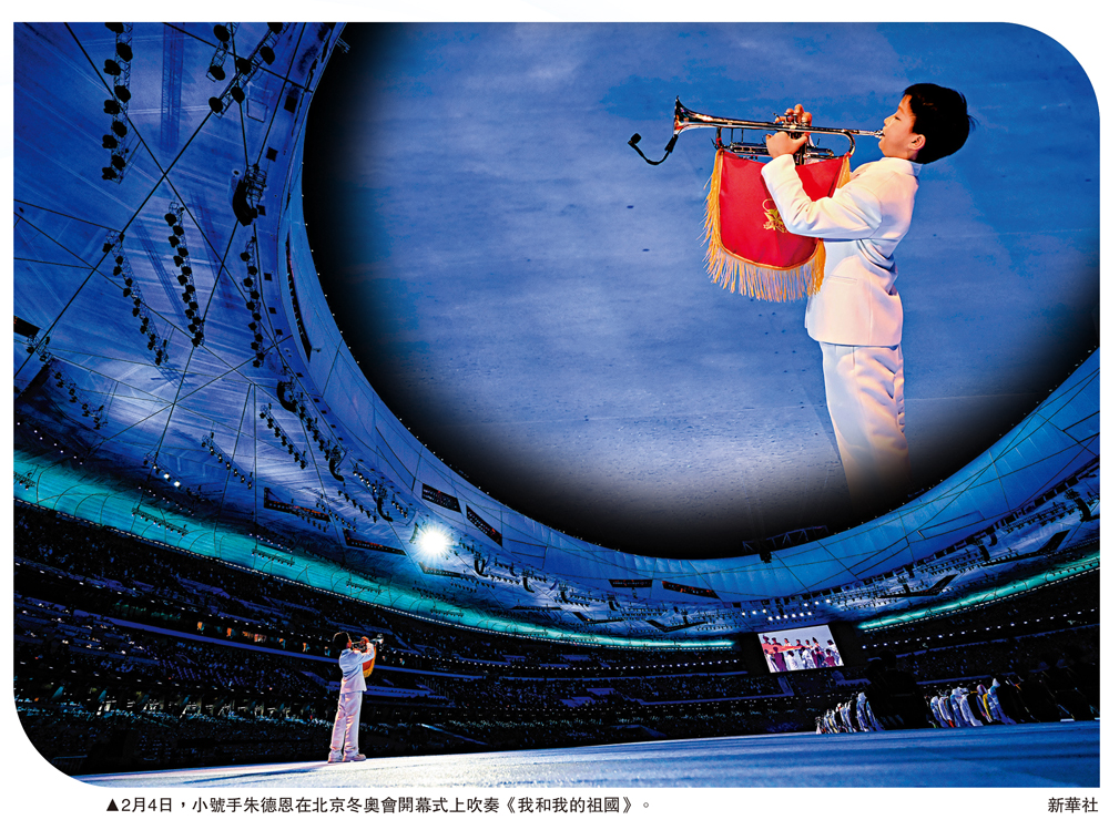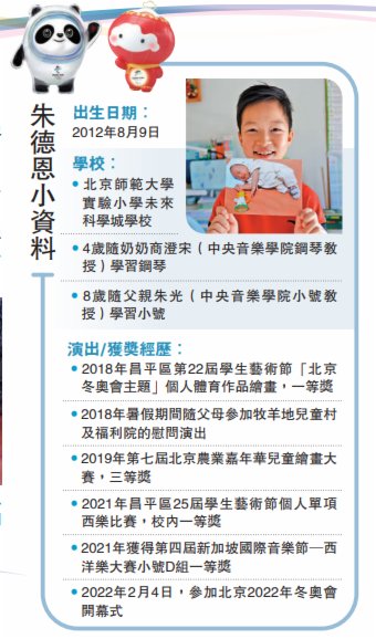 (大公報記者 朱燁)在北京2022年冬奧會開幕式現場,有位身着白色衣服、腰桿挺直的小男孩,在傳遞國旗環節,奮力鼓起腮幫,用小號吹響了《我和我的祖國》。嘹亮的樂聲響徹鳥巢,讓不少人淚目。這便是出生於音樂世家、僅9歲的朱德恩,他被網友稱為開幕式「吹號男孩」。朱德恩的媽媽張雅楠說,從臨時拿到《我和我的祖國》曲譜到錄製吹奏視頻發給奧組委,只有3小時,而孩子並沒有接觸過這首曲目,但在爸爸的「魔鬼訓練」下,朱德恩頂住壓力,成功入選。