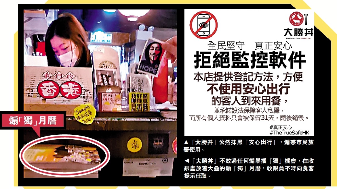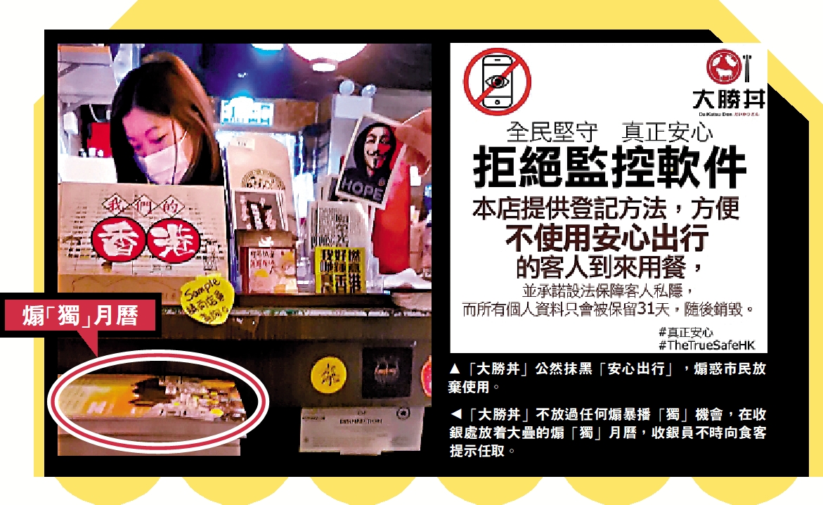 2020年2月17日,該店貼出抵制政府防疫文宣,稱「拒絕監控軟件」,誤導市民。去年6月24日反中亂港媒體《蘋果日報》停業,「大勝丼」即貼出撐《蘋果》的海報。同月16日其專頁貼出鼓吹大示威,煽人仿效黑暴時期上街,亂港之心昭然若揭。