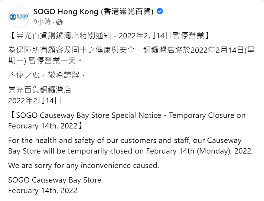 崇光百貨表示,為保障所有顧客及同事之健康與安全,崇光百貨銅鑼灣店於今日(14日)暫停營業一天。