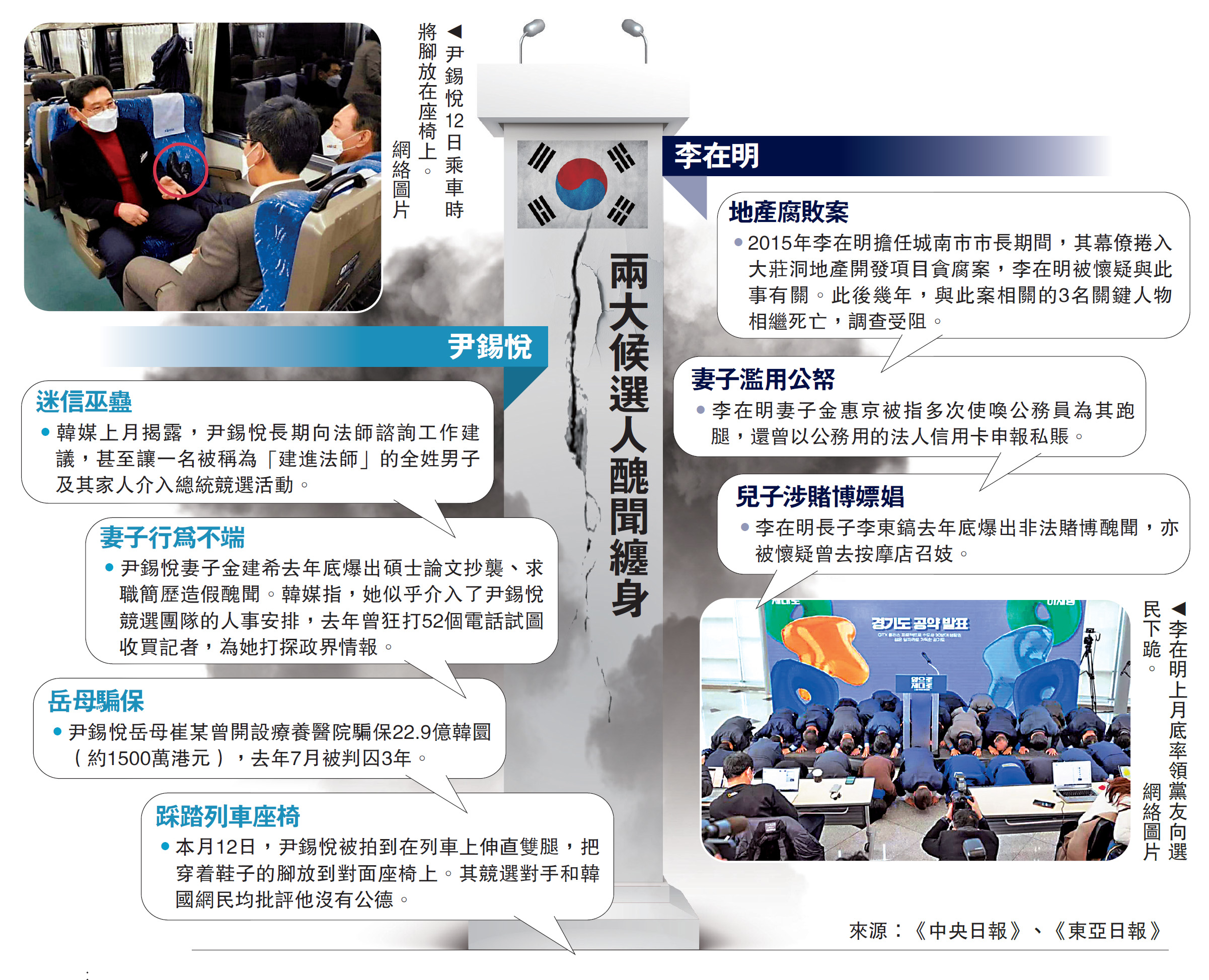 李在明擔任城南市市長期間的大莊洞地產項目貪腐案近期被翻出,令其參選資格受到質疑;尹錫悅被指長年迷信巫蠱之術,甚至讓法師介入競選活動。他們家屬的黑歷史亦被挖出。李在明的妻子金惠京涉嫌使喚公務員跑腿及濫用公帑,長子捲入賭博和嫖娼醜聞;尹錫悅的妻子金建希不僅論文抄襲、履歷造假,還試圖收買一名《首爾之聲》記者,讓他「偷偷摸摸打探情報」。