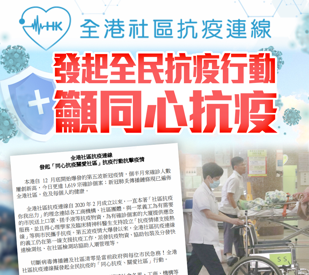 玉湖集團及香港賽馬會分別向「全港社區抗疫連線」捐贈500萬港元及1000萬港元,用作購買防疫物資,此外,「全港社區抗疫連線」亦已收到熱心機構捐出十萬份快速測試劑,其他物資亦不斷募集中。