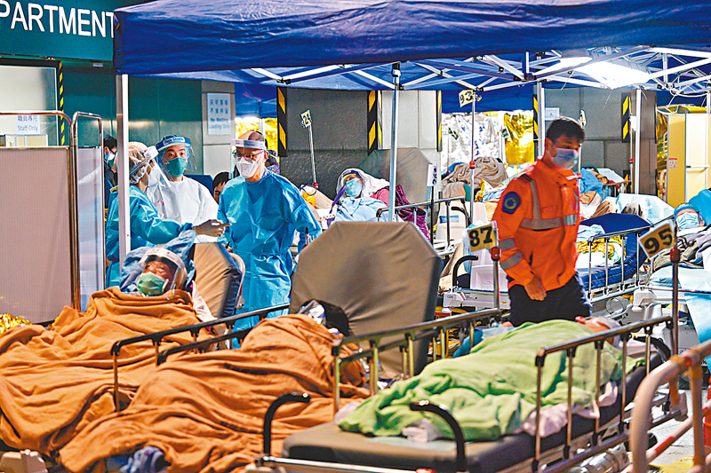 (香港文匯報 記者 文森)香港第五波疫情肆虐,公立醫療系統瀕臨崩潰,除醫院隔離病床飽和,無法收治確診及初確病人外,公院每日也有大批醫護人員染疫,令醫院前線「打仗」的員工人數減少,工作壓力大增。香港文匯報連日來追訪多名堅守崗位的公院醫護,聽取他們訴說與病毒奮戰的心路歷程。不少醫護形容,病房情況惡劣,目睹病人的治療條件欠佳,他們坦言:「好心痛,但愛莫能助。」其中,屯門醫院任職病人服務助理的劉小姐透露,目前人手嚴重不足,每日與病毒苦戰,心理壓力巨大,「不敢到飯堂用膳,放工後才醫肚,回家後立即洗澡半小時,怕沾染病毒並帶回家中。 」