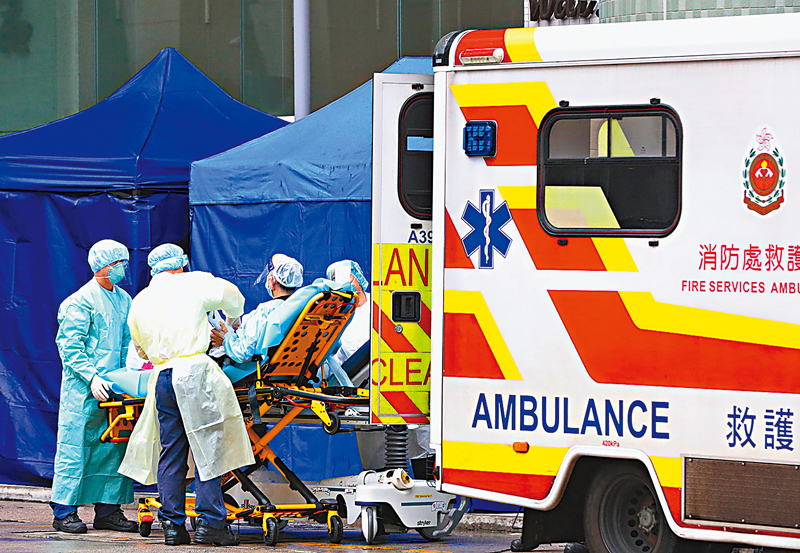 近日確診個案急升,消防處表示接獲大量患者召喚救護車入院或到檢疫設施,對緊急救護服務造成沉重壓力,人手不足,消防處救護車當值人數已由3人減至兩人,處方已在不同編制抽調人員協助。有救護員工會指,有關情況絕對不理想,救護員又未獲派快速檢測包,擔心感染後不自知,部分人因此有家歸不得,租住酒店。