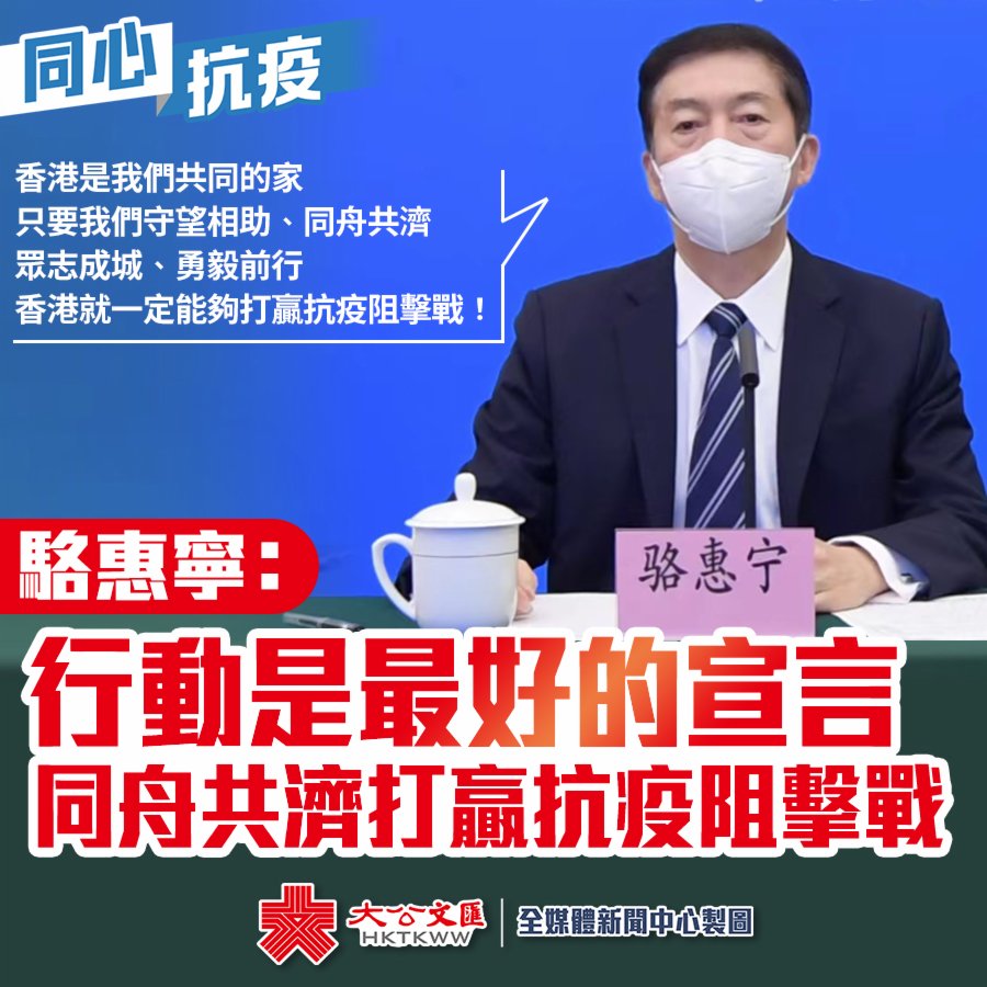 駱惠寧強調,行動是最好的宣言。非常之時要有非常之策。中聯辦將按照中央統一部署,全力支持特區政府擔當好疫情防控的主體責任,全力協助中央有關部門和地方做好援港抗疫工作,全力推動愛國愛港陣營和社會各界凝聚同心抗疫的強大力量。