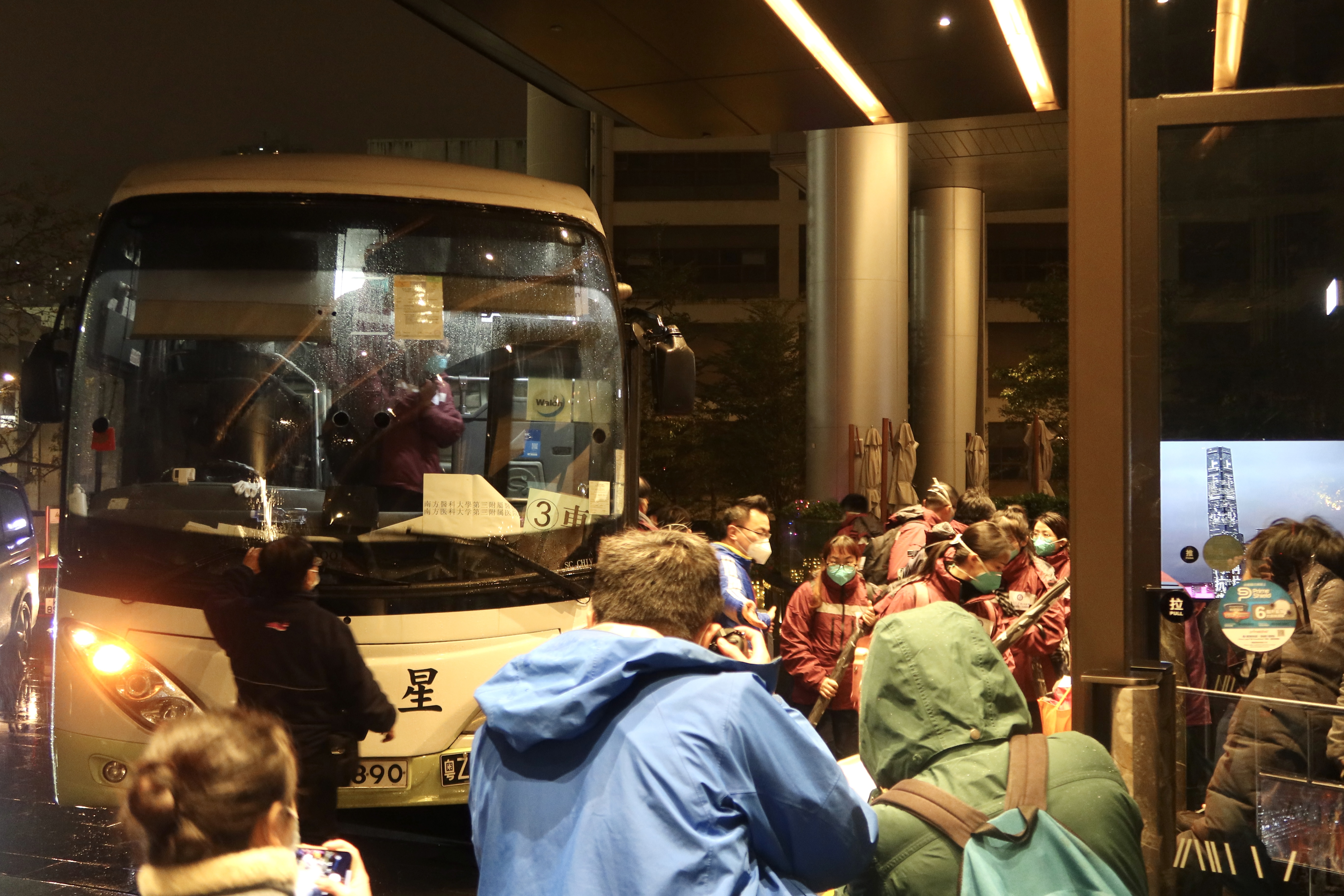 全體隊員114人依次從數輛大巴車上下來,他們身着統一制服,深紅色的衝鋒衣,背後印有四個大字「中國衞生」,字體在黑暗中的閃光讓人不由得感受到來自祖國堅實的力量,香港有救了!