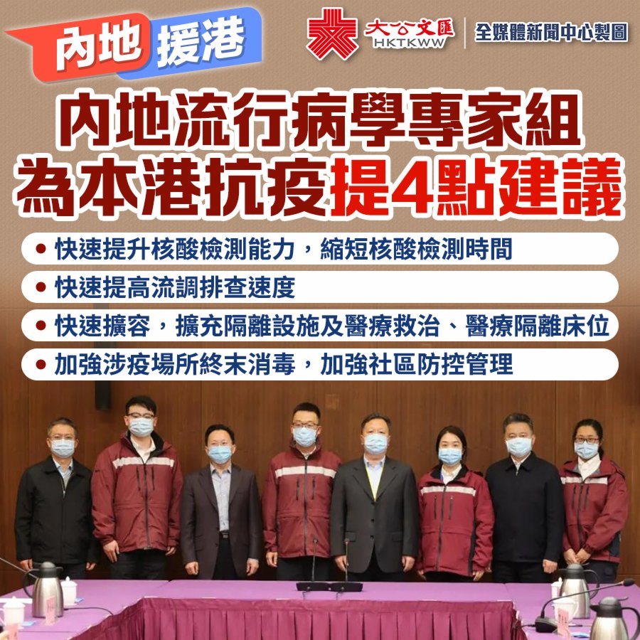 大公文匯全媒體報道,內地專家和檢測團隊陸續抵達香港,內地支援香港抗疫重症專家組繼續在香港考察,今日(21日)上午到訪威爾斯親王醫院,與醫管局代表針對新冠重症案例進行討論和研究。國家疾控局副局長、國家衞生健康委應急辦主任孫陽在接受電視台採訪時表示,17日抵達香港的首批內地支援香港抗疫流行病學專家組,針對香港疫情的特點、存在的問題,提出了四點建議,包括: