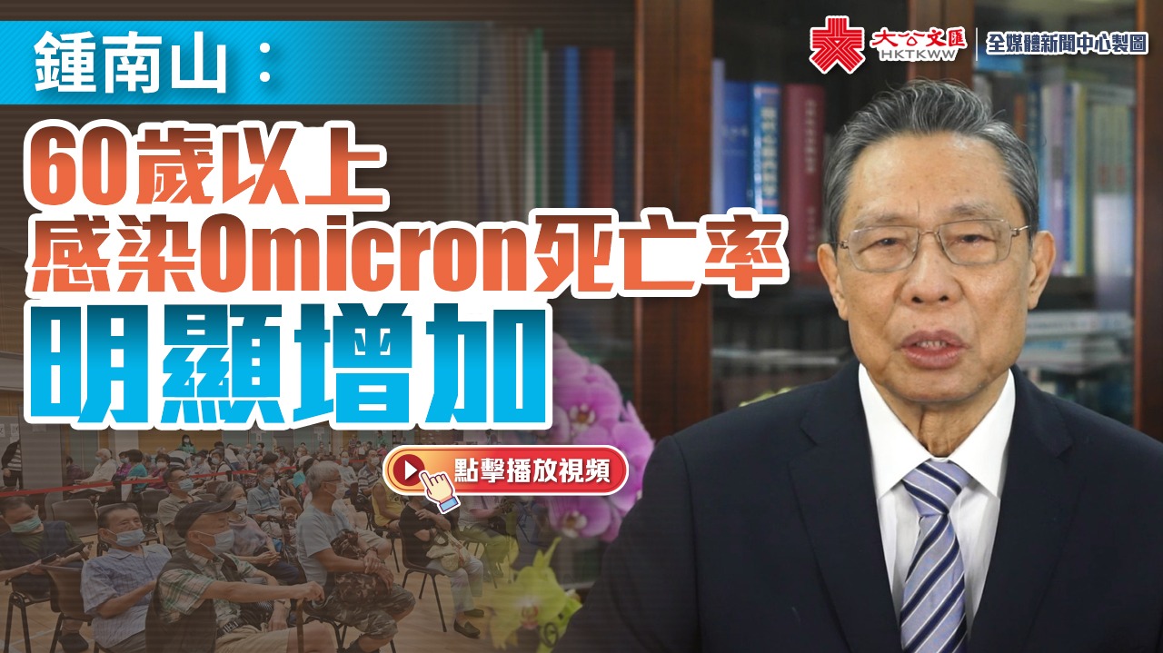 鍾南山表示,與其他病毒株比較,Omicron患病症狀較輕,主要在鼻咽及大氣道,肺炎的發生率相對較少,死亡率較低,接近於季節性流行性感冒,所以市民不用過於擔憂。但是它的危害性遠遠大於流感,Omicron傳染性強,流感是1個傳1至2個,Omicron是1個傳6至7個,所以它的傳播性大大高於流感。並且,Omicron令60歲以上的人群死亡率增加。儘管病死率低,但根據英國衞生安全局(UKHSA)2月初發表的統計,60至69歲死亡率為2.65%,70至79歲9.87%,80歲以上21.0%,現在香港的粗死亡率為0.15%,若大批的感染在60歲以上的人群,死亡率會明顯增加。