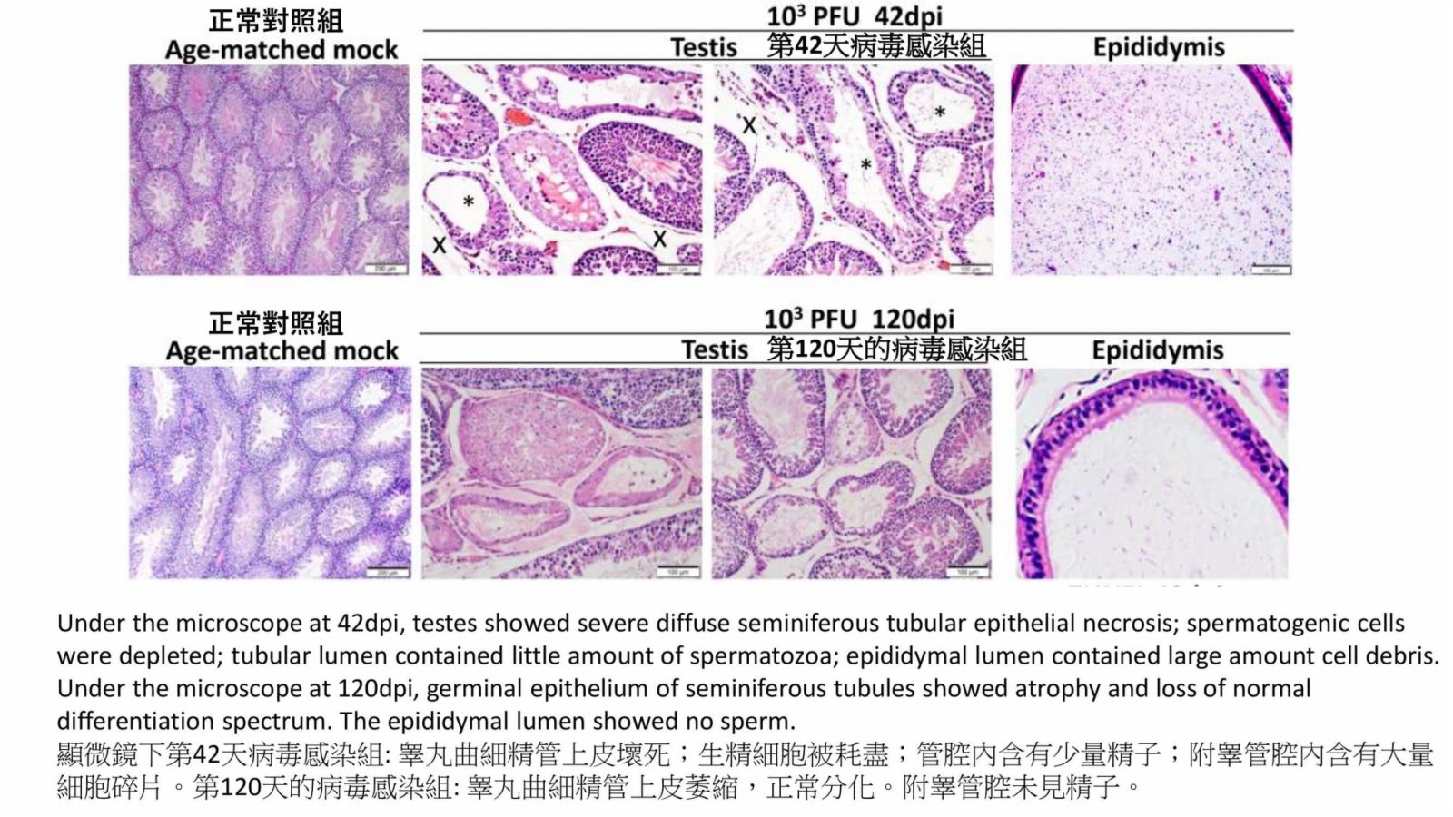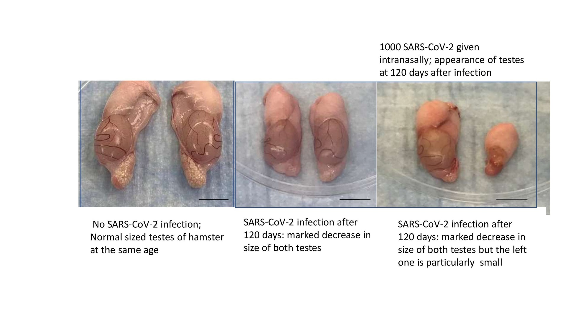研究團隊利用兩組倉鼠進行實驗,分別感染新冠病毒和流感病毒,然後比較兩組倉鼠的睪丸和性激素的變化。當中感染新冠病毒的一組倉鼠出現較為輕微的自愈性肺炎,可以不治而愈,但有關倉鼠的精子數量和血清內的睪丸酮在4到7天之內急劇下降。在感染42到120天後,倉鼠的睪丸萎縮, 尺寸和重量下降,同時體內的性激素水平顯著降低,而Omicron和Delta變種病毒也能引起類似的損傷。相反,感染流感病毒的倉鼠並無以上情況出現。