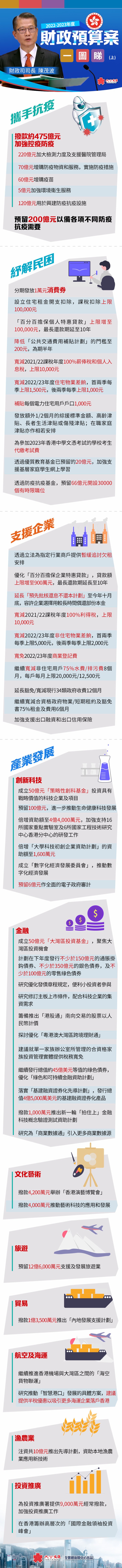 財政司司長陳茂波今日(2月23日)發表新一份財政預算案,陳茂波表示,抗擊疫情是當前壓倒一切的要務,政府會動用一切可以動員力量和資源穩控疫情。這份預算案繼續採取擴張性財政政策,措施主要圍繞四個方面:(一)全力抗擊戰勝疫情;(二)為市民和中小企紓困;(三)為下行的經濟提供支撐,並推動疫後的經濟恢復;以及(四)投資未來,部署經濟中長期的發展。以下,大公文匯全媒體為您拆解最新的財政預算案。