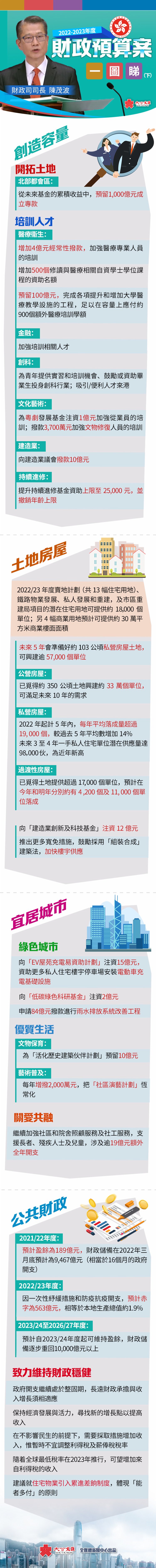 財政司司長陳茂波今日(2月23日)發表新一份財政預算案,陳茂波表示,抗擊疫情是當前壓倒一切的要務,政府會動用一切可以動員力量和資源穩控疫情。這份預算案繼續採取擴張性財政政策,措施主要圍繞四個方面:(一)全力抗擊戰勝疫情;(二)為市民和中小企紓困;(三)為下行的經濟提供支撐,並推動疫後的經濟恢復;以及(四)投資未來,部署經濟中長期的發展。以下,大公文匯全媒體為您拆解最新的財政預算案。