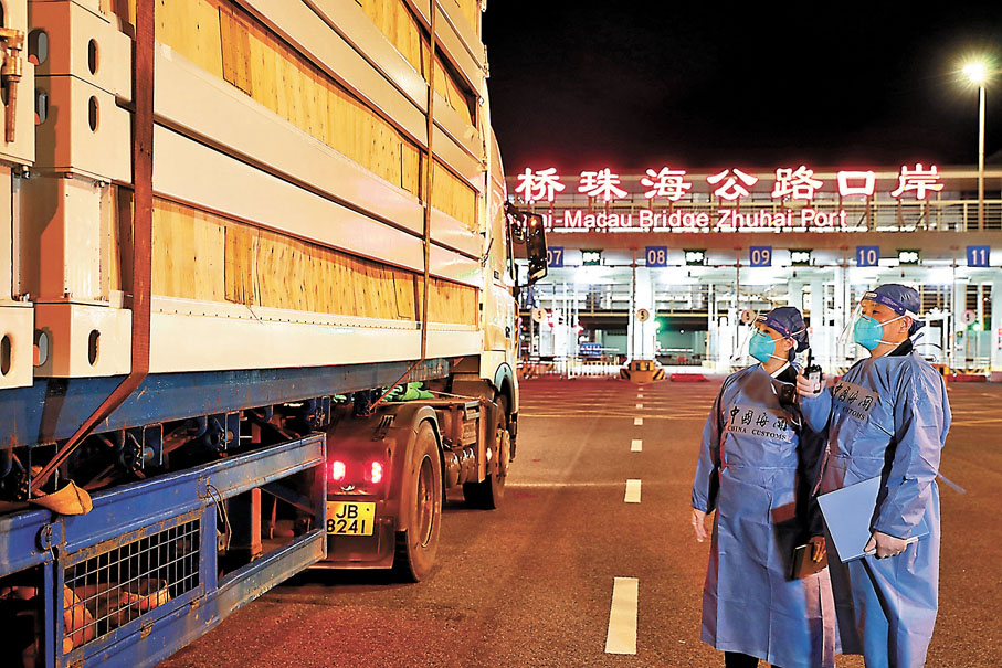目前香港新冠肺炎疫情形勢嚴峻,跨境運輸受到影響,香港面臨農產品供貨緊張、價格上漲的壓力。為提升跨境運輸通行效率、減少疫情防控風險,港珠澳大橋預先研判社會需求和業務特性,創新查驗模式,在完善內控程序後,主動對接通行大橋的供港鮮活農產品運輸企業,目前正試行對供港鮮活農產品運輸車輛的「雲驗放」。