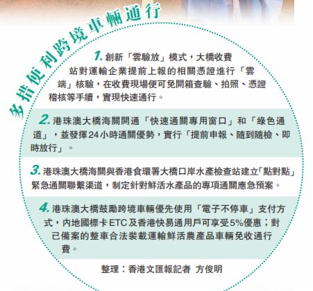 另據港珠澳大橋客服中心提示,結合粵港澳三地近期疫情防控需要,為降低疫情傳播風險,保障跨境運輸人員及大橋工作人員疫情安全,跨境運輸車輛通行大橋時優先使用「電子不停車」支付方式,內地國標卡ETC(Electronic Toll Collection,電子不停車收費系統)及香港快易通用戶可享受5%優惠;而對整車合法裝載運輸鮮活農產品(符合《鮮活農產品品種目錄》規定的品類)車輛,免收當次車輛通行費,須提前聯繫港珠澳大橋客服中心進行備案。