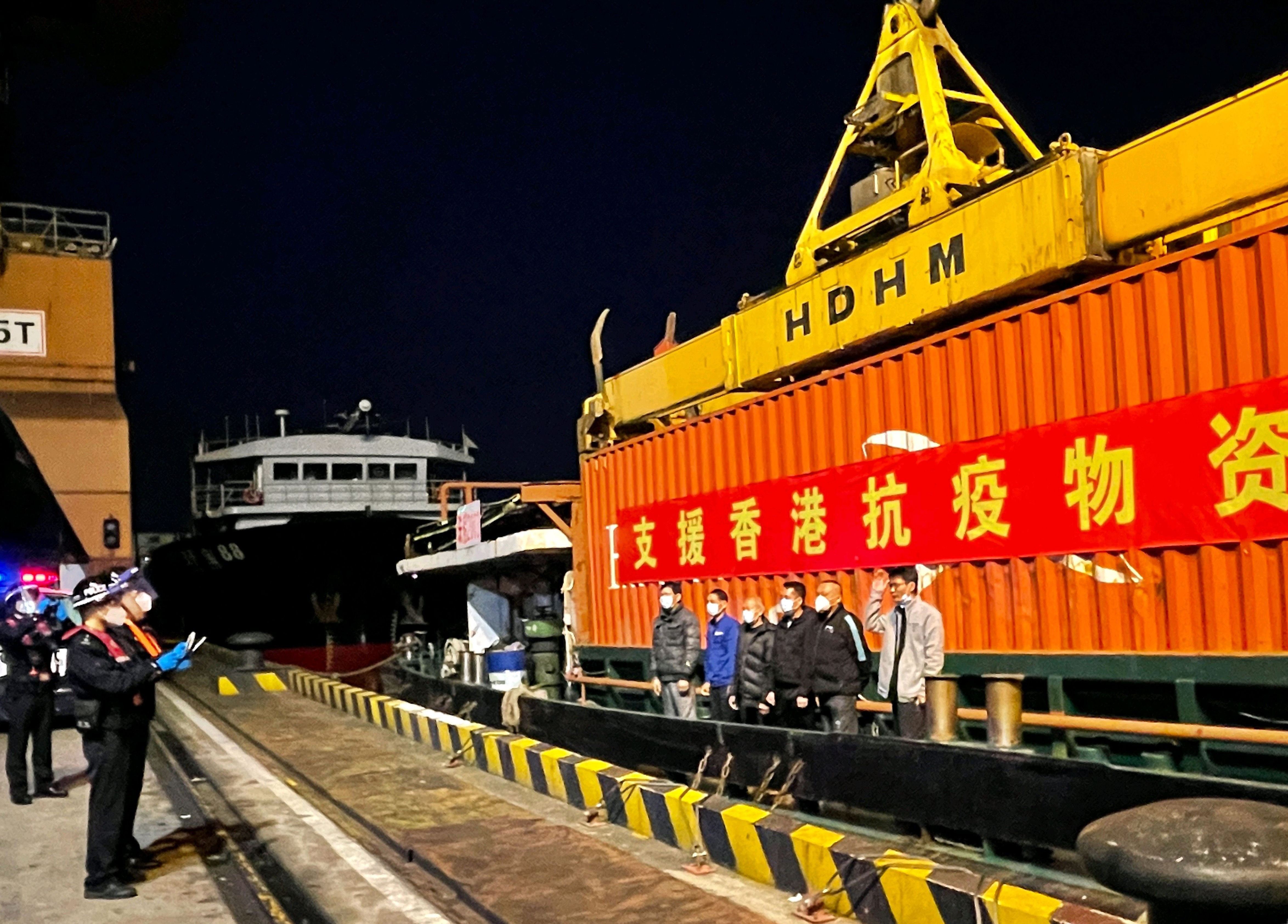 為保障載運供港防疫物資船舶抵港即可生產作業、出境通關「零等待」,順德邊檢站啟動「供港防疫物資專用綠色通道」,提前協調碼頭調度為「粵金輪988」號船優先安排靠港泊位,船舶抵港裝載物資的同時,邊檢民警快速為船舶船員辦理出境手續。24日晚23時35分,「粵金輪988」號船駛離北滘港,預計25日中午即可到達香港。