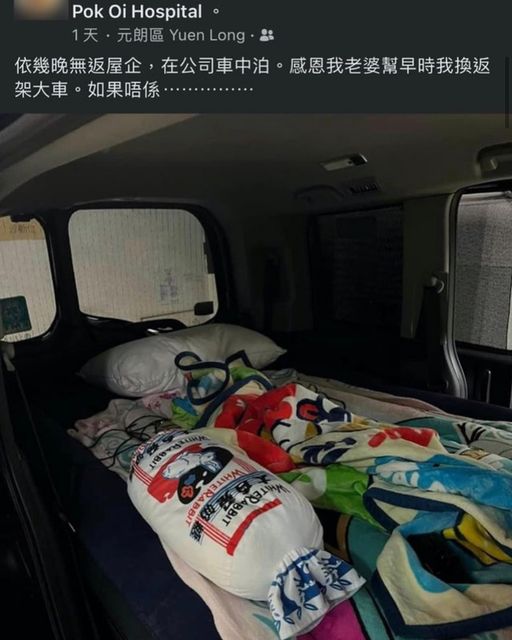 發文網民在帖文中設置了「博愛醫院」的標籤。帖文提及,他數天以來下班後均沒有返家,反而選擇在私家車內「車中泊」。從相片中可見,他將私家車的座椅拉下平放,並放上枕頭、毛氈及抱枕等物品,從而「改造」出一張單人床,卻依然笑稱幸好太太早前幫忙「換返架大車」,否則也沒有「車中泊」的選項。