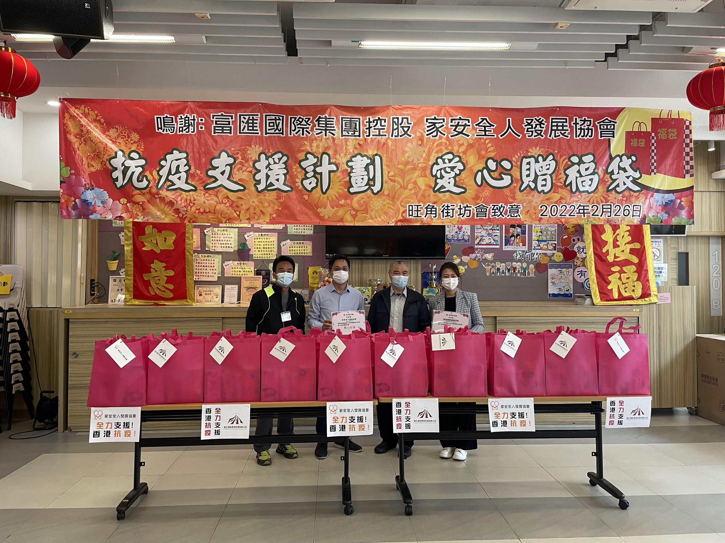 富匯國際集團同時派代表與家安全人發展協會於今日(26日)向旺角街坊會贈送防疫福袋,福袋包括快速測試套裝、口罩等防疫物資及日常用品,協會亦到街上贈送福袋給有需要的街坊。
