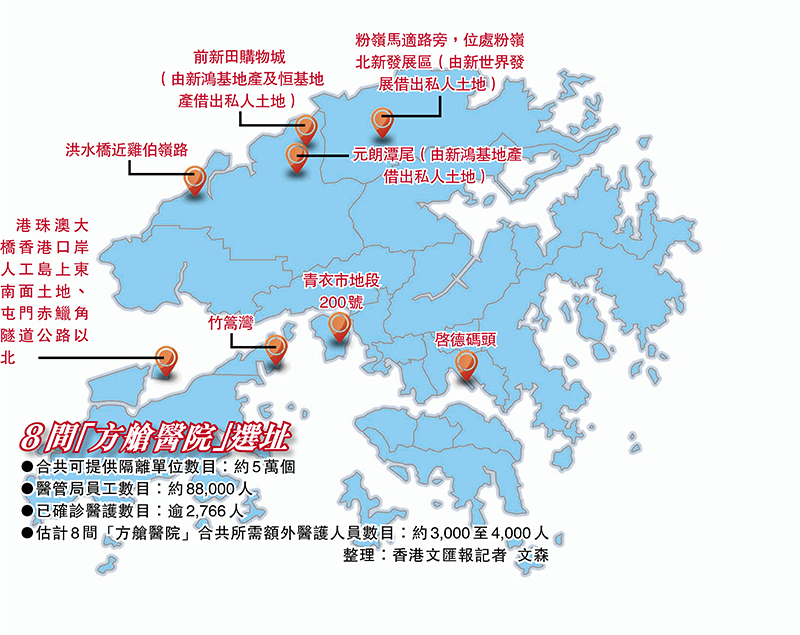 8間「方艙醫院」正在緊鑼密鼓建設中,作為永久性設施的竹篙灣及啟德碼頭兩間「方艙醫院」合共提供上萬個單位,而青衣、前新田購物城、元朗潭尾和洪水橋4個項目則提供1.4萬至1.7萬個隔離單位,另港珠澳大橋人工島項目和粉嶺項目亦正全力建設,根據以上資料,每間臨時醫院平均有四五千個單位收治新冠病人。