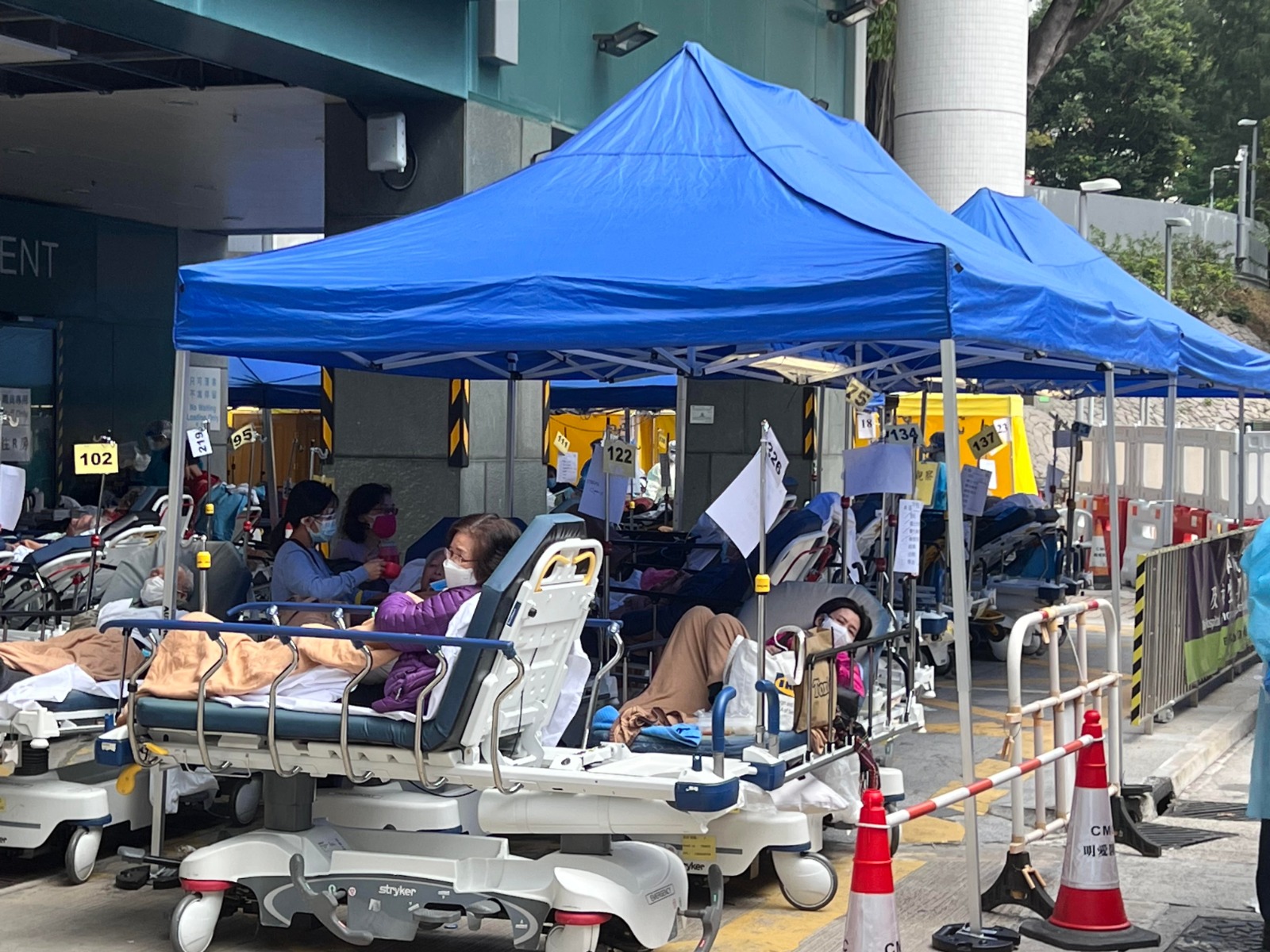大公文匯全媒體報道,香港第五波疫情嚴峻,今日(28日)新增34466宗確診個案,再創疫情以來新高。明愛醫院過去兩天再現急症室外堆滿病床,病人須長時間逗留在室外,等候治療或入院。據了解,截至今日中午時段,仍有30至40名病患躺在明愛醫院急症室外的病床上,當中不乏諸多長者。
