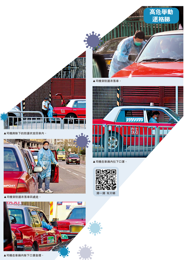 記者直擊有「的哥」接載「疫客」之後,未有即時消毒車廂,還身穿已污染的保護衣離開車廂與行家「吹水」、接客途中隨意拉開面罩或拉低口罩,以及將用過的保護衣長時間留在車廂等,此等不當行為恐會增加「播毒」風險。