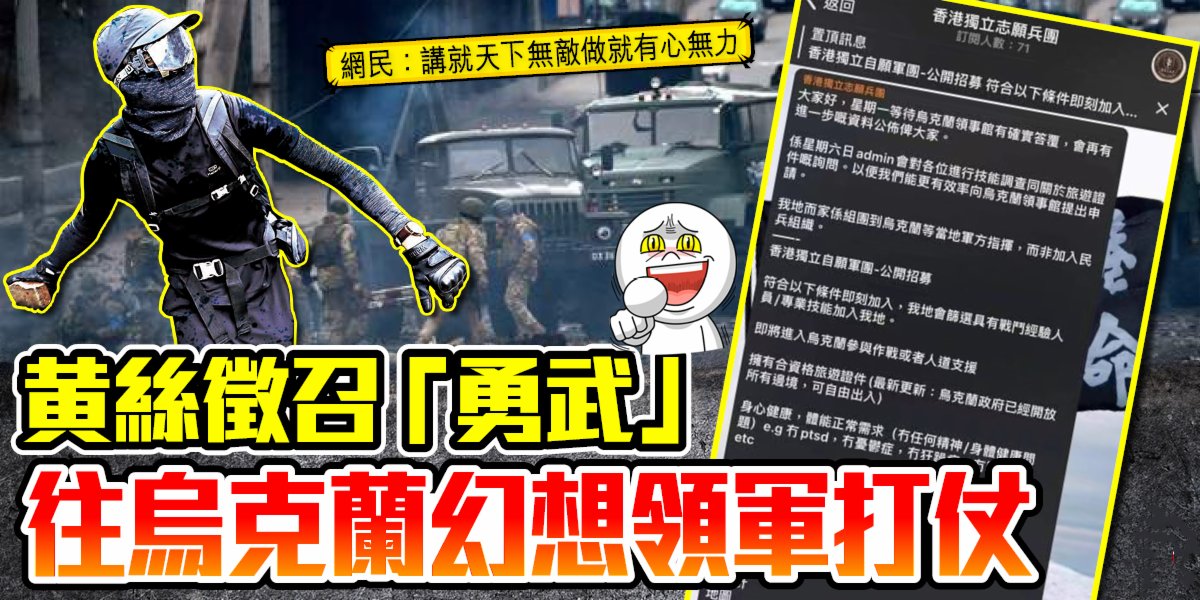 大公文匯全媒體報道:烏俄戰火持續延燒,有黄絲湊熱鬧在網上發帖,公開招募「香港『獨立』自願軍團」,煽人衝到烏克蘭領軍打仗。帖文列出一系列的條件和裝備要求,仲話會篩選具有「戰鬥經驗」人員,疑似召集黑暴嘅「勇武暴徒」、「死士」復出上前線。