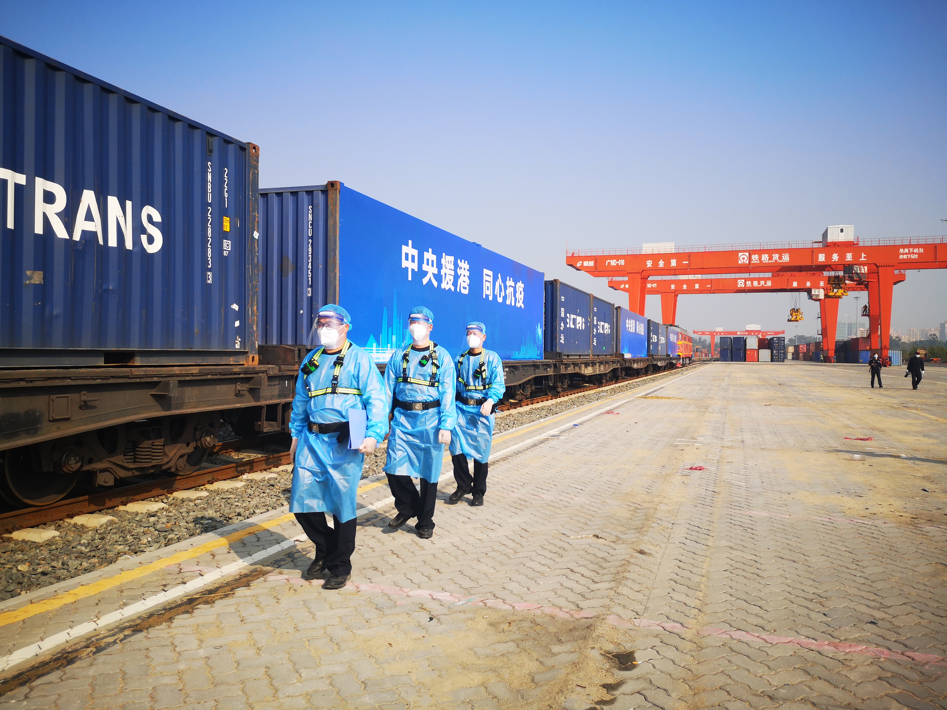記者了解到,該班列裝運的連花清瘟膠囊、新冠病毒檢測試劑盒、防護服等疫情防控物資,抵港後將於當天迅速送往抗疫前線。
