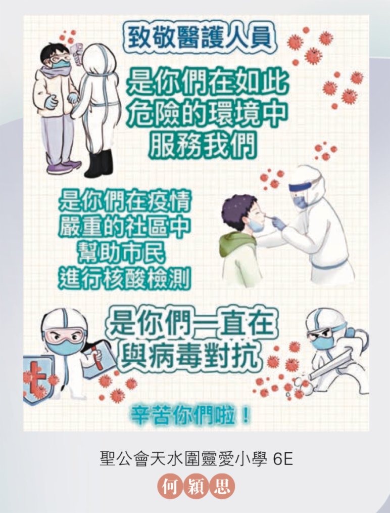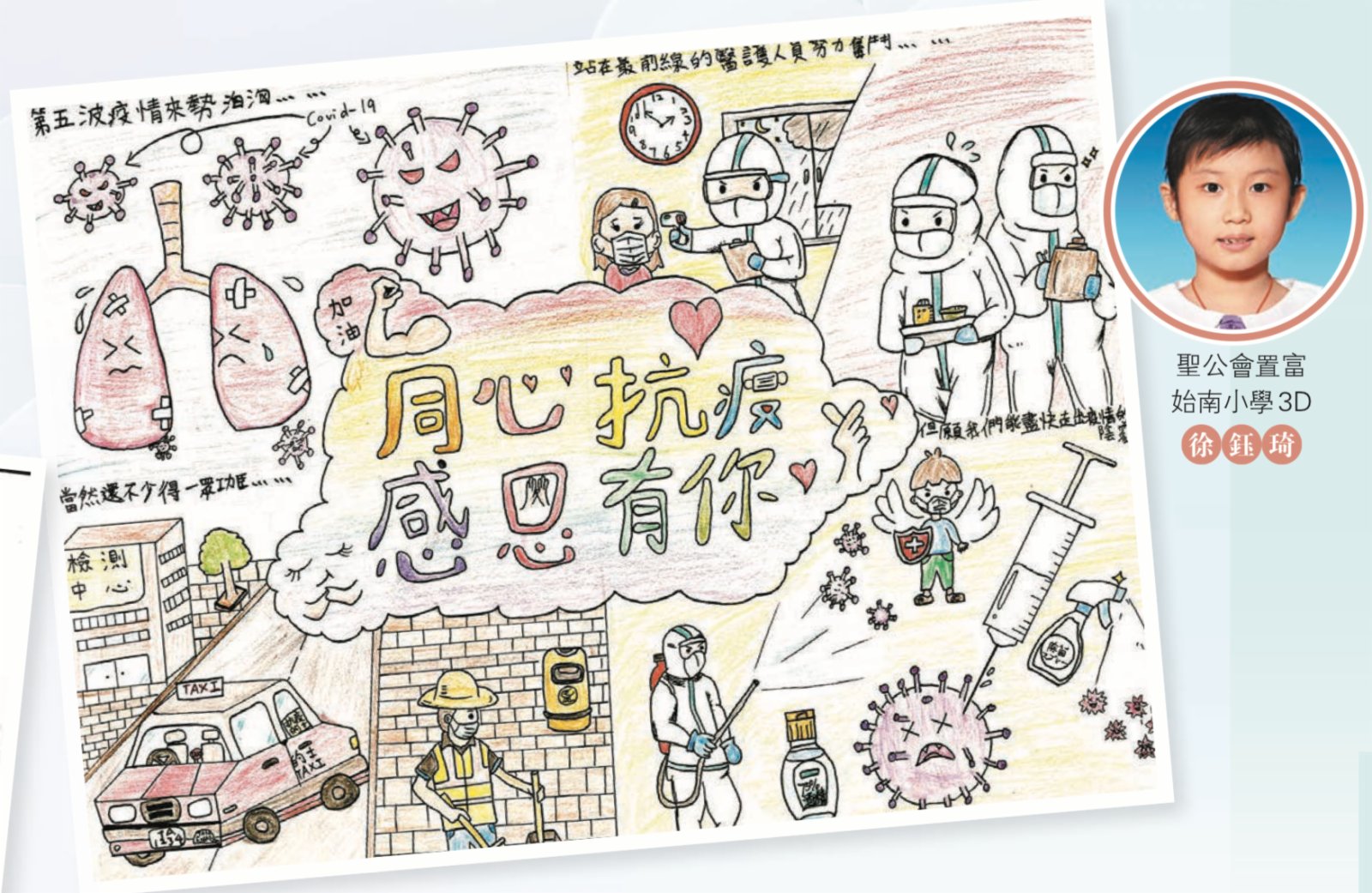 香港疫情持續嚴峻,全港學校提前放暑假讓社會集中精力應對當前挑戰。年幼學生雖未能走上前線,亦未必適合參與義務工作,惟抗疫之心同樣堅定。現時醫護人員、紀律部隊、義工、內地支援人員等前線抗疫工作者傾盡全力抗擊疫情,同學們亦希望向疫情一線的英雄們送上真摯祝福及敬意,並為香港抗疫加油打氣。