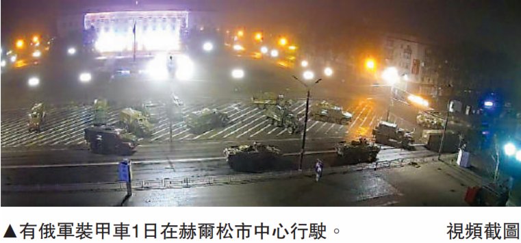 俄國防部發言人科納申科夫2日表示,俄軍已完全控制靠近克里米亞的烏南部城市赫爾松,市內民用基礎設施、民生保障設施與城市交通運轉正常,沒有發生食品與必需品短缺情況。有視頻顯示,俄軍裝甲車和軍用貨車在市中心行駛。但烏克蘭國防部否認赫爾松陷落,稱「戰鬥仍在進行,城市未被完全佔領」。