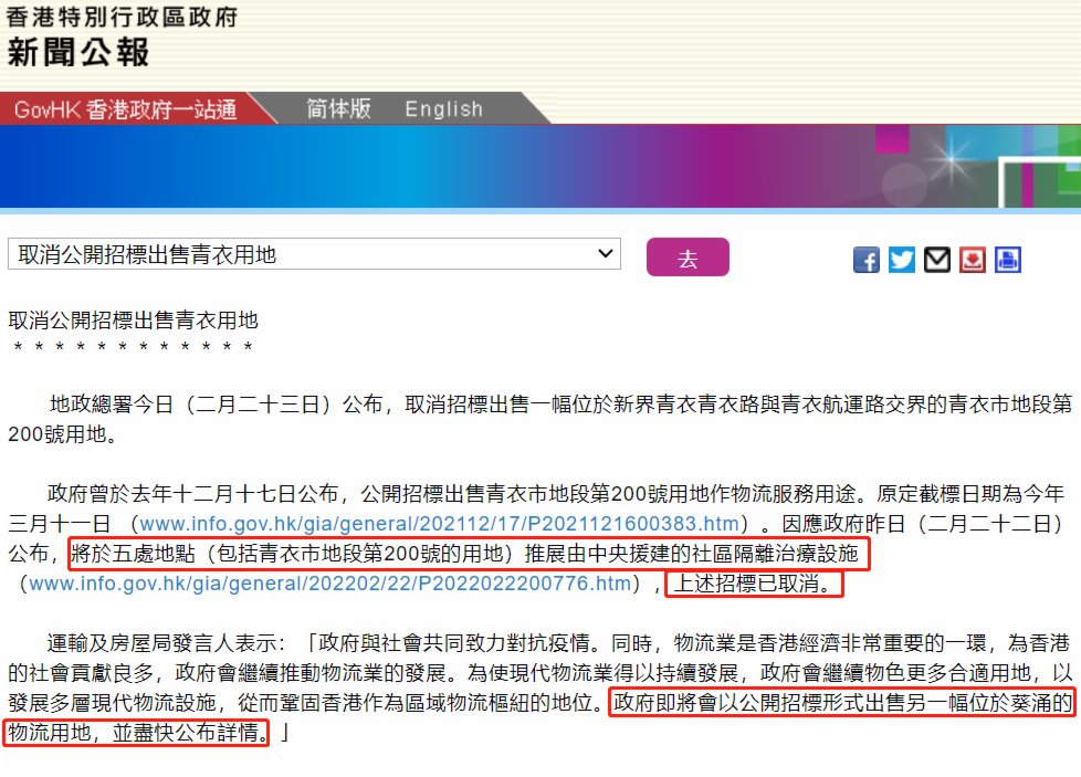 在決定將這塊用地用作建設方艙醫院後,上述招標已於23日正式取消,取代它將用於出售的是另一幅位於葵涌的物流用地。