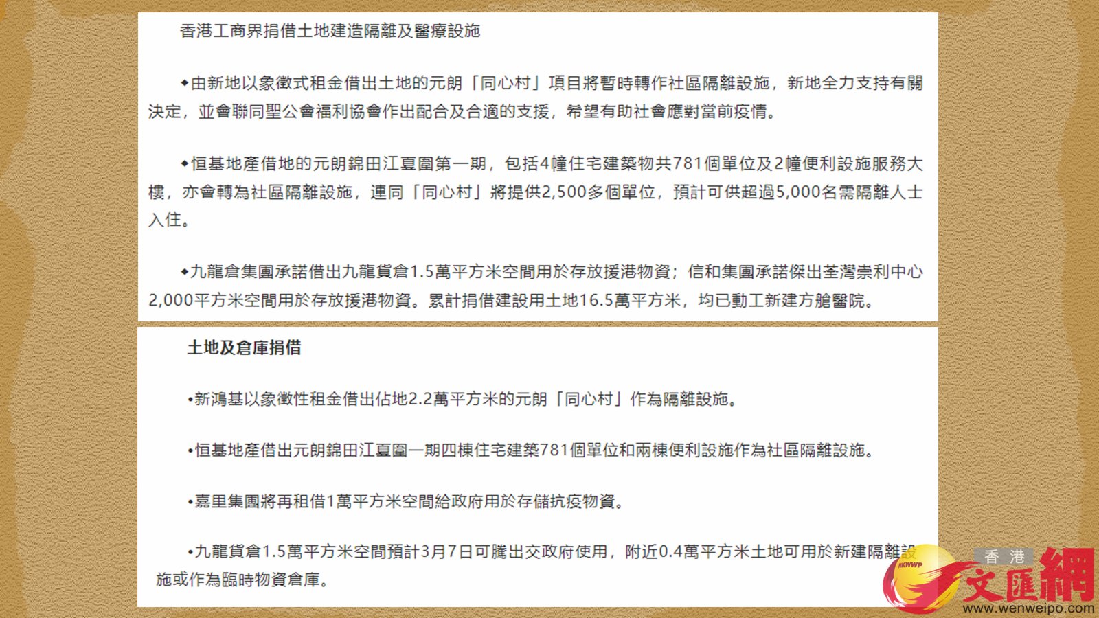 除此之外,還有不少企業陸續宣布借出土地、倉庫、酒店等處所,用作隔離措施。