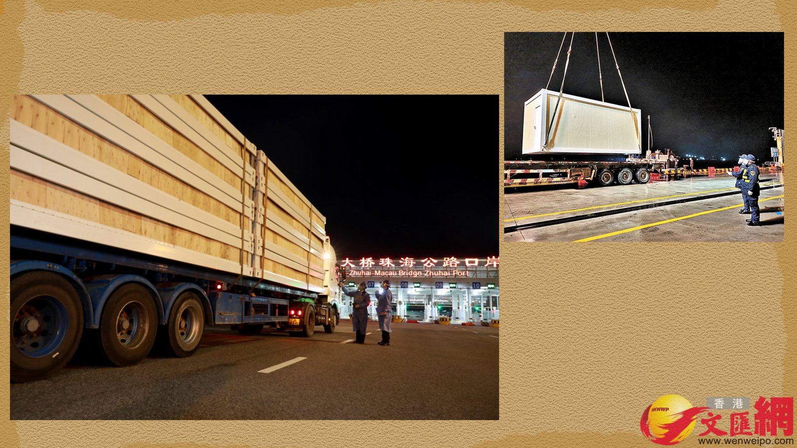 在港珠澳大橋上,一輛輛貨車陸續開出,在海關高效監管下快速通關,車上裝載着方艙醫院建設所需的「活動房屋」。除此之外,還有中山黃圃港碼頭等水路運輸。