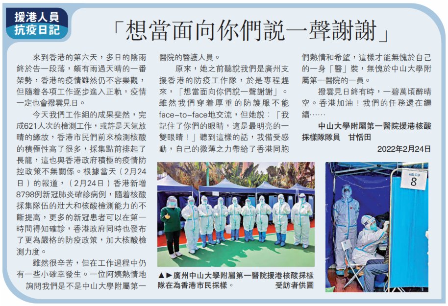 中山大學附屬第一醫院援港核酸採樣隊隊員甘恬田記得,來到香港的第六天,多日的陰雨終於告一段落。
