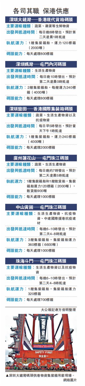 同時,每條航線運輸供港物資也有一定種類的分工。譬如「深圳大鏟灣─香港現代貨箱碼頭」航線主要運輸生鮮物資。「深圳鹽田─香港國際集裝箱碼頭」航線主要運輸生活生產物資以及抗疫物資。「中山黃圃─屯門珠江碼頭」航線主要專供援港抗疫建材運輸。