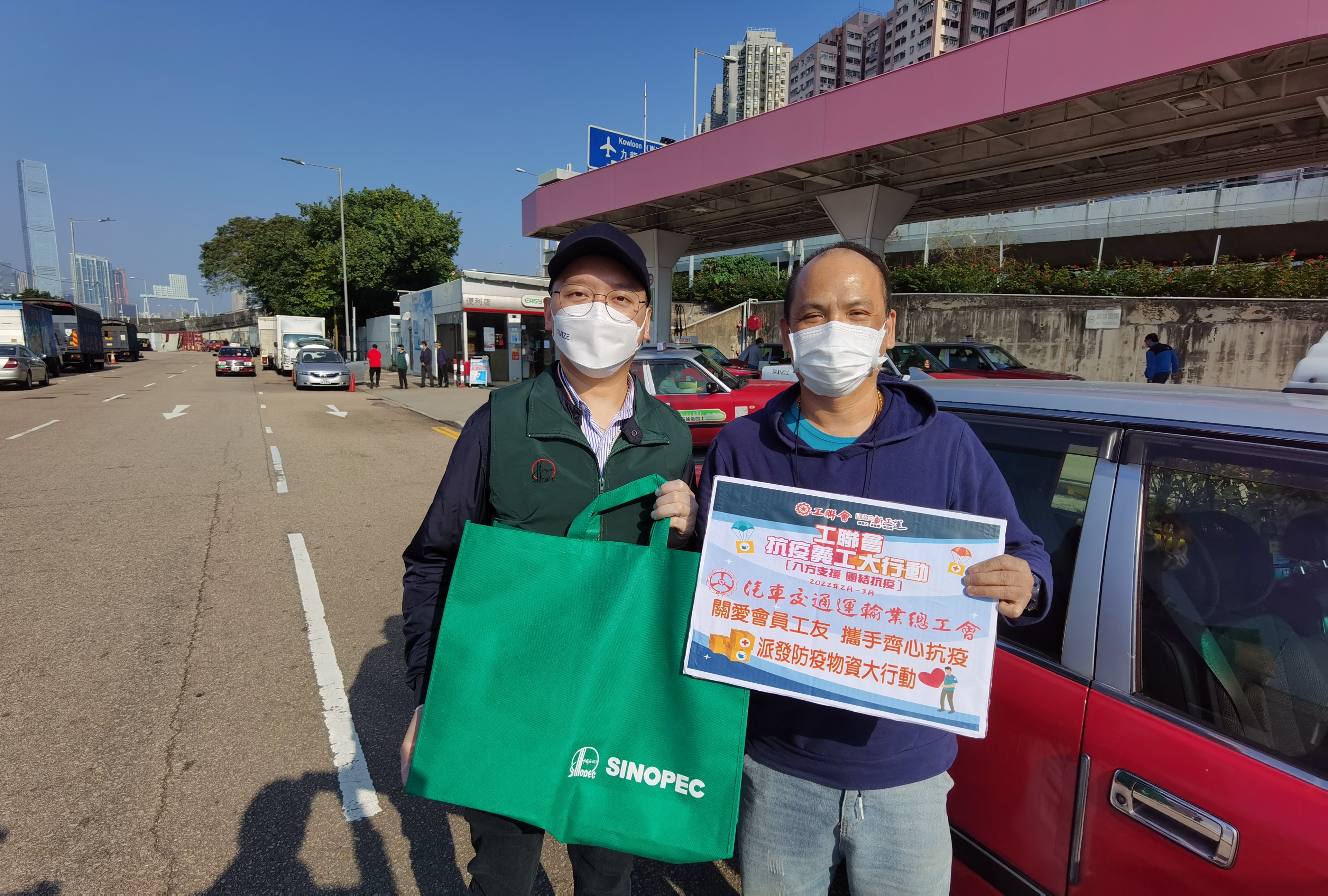 全國政協委員、香港工聯會理事長、立法會議員黃國與中國石化抗疫義工隊今日(3日)在中國石化上環加氣站為香港巴士、的士司機派發400餘份防疫藥包。