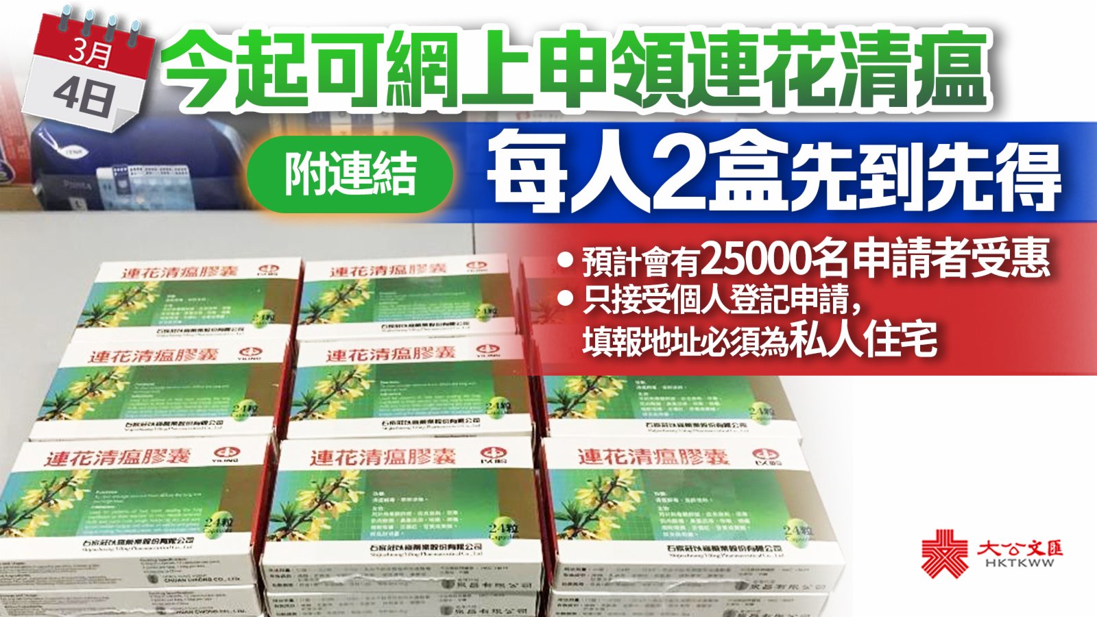 大公文匯全媒體報道,本港第五波疫情持續嚴峻,確診人數大增,「全港社區抗疫連線」(連線)昨日宣布將派發中央援港的5萬盒「連花清瘟膠囊」予市民作抗疫之用,市民今日(4日)中午12時起可以透過網上登記,以先到先得形式申請,每名合資格登記者可獲發2盒24粒裝港版「連花清瘟膠囊」,預計會有25000名申請者受惠。