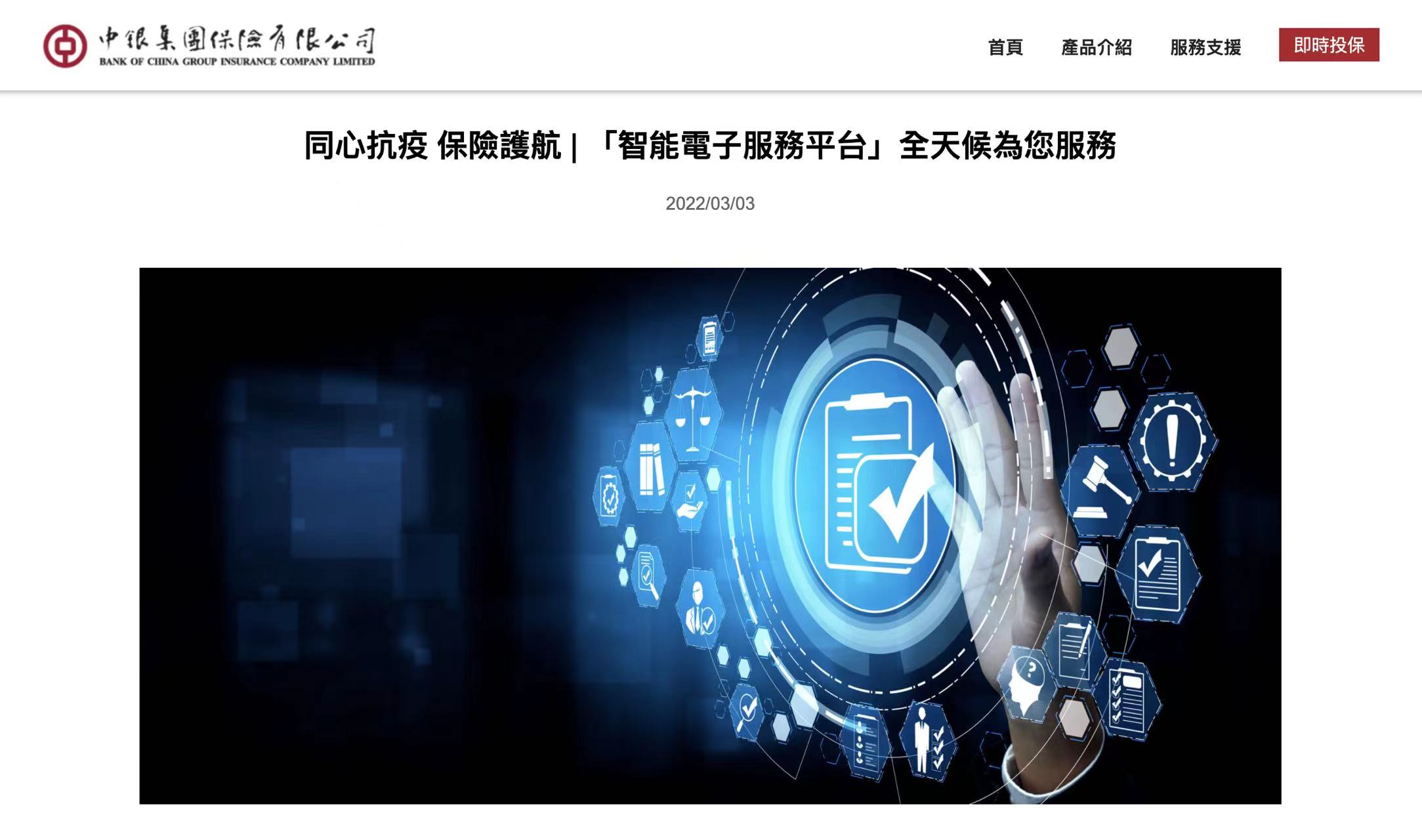 中銀集團保險網上即時投保平台為市民提供24小時投保平台,涵蓋多款熱門保險產品,包括醫療、個人意外、家居、家傭及汽車保險等,個別產品更設新冠肺炎延伸保障。
